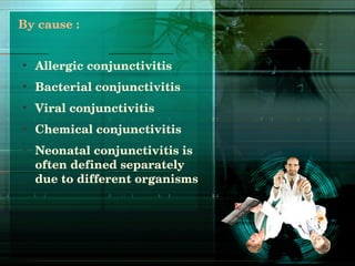 Conjunctivitis is an inflammation of the outer eye and eyelid, categorized into allergic, bacterial, viral, chemical, and neonatal types, characterized by red eyes, swelling, and watering. Diagnosis typically involves empirical treatment rather than cultures, while hygiene is crucial for prevention. Recommended treatments vary by cause, with suggested home remedies and golden eye drops for minor infections, and further consultation is advised if symptoms persist.