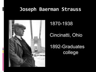 The document provides details about the construction of the Golden Gate Bridge in San Francisco. It describes Joseph Strauss, the chief engineer for the project. Key events included Strauss presenting the proposal in 1919, approval being given in 1923, and construction beginning in 1929. Safety measures introduced during construction included hard hats and respirators. The bridge opened in 1937 after over 887,000 tons of material were used. It has since become an iconic landmark and engineering achievement.