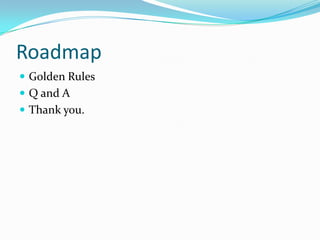 The document outlines eight golden rules for success: 1) Be humble, 2) Forget what you know and continuously learn, unlearn, and relearn, 3) Think big and come up with futuristic ideas, 4) Take risks and be willing to break things to move forward, 5) Be passionate, 6) Be innovative by balancing thinkers and developers, 7) Make things simple rather than complex, and 8) Get shit done. The document concludes by thanking the audience for listening and hoping it made sense.