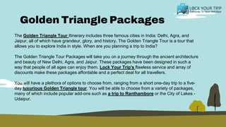 The Golden Triangle Tour in India encompasses the historical cities of Delhi, Agra, and Jaipur, offering travelers a rich glimpse into the country's grandeur and architectural beauty. Packages are available for various trip lengths and can include popular add-ons like Ranthambore and Udaipur, making it accessible and affordable for all ages. Lock Your Trip, an Indian online travel agency, has been providing exceptional service since 2019 and is dedicated to ensuring client satisfaction.