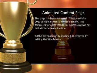 This PowerPoint template contains various layouts and placeholders for topics, images, graphs, and other elements. It includes sections for agendas, two-column text, bar graphs, comparisons, pie charts, smart art, pictures, and quick facts. The templates are designed for PowerPoint 2007 or later, and some elements like videos and smart art may not appear correctly in older versions. All aspects of the templates can be modified by editing the slide master.