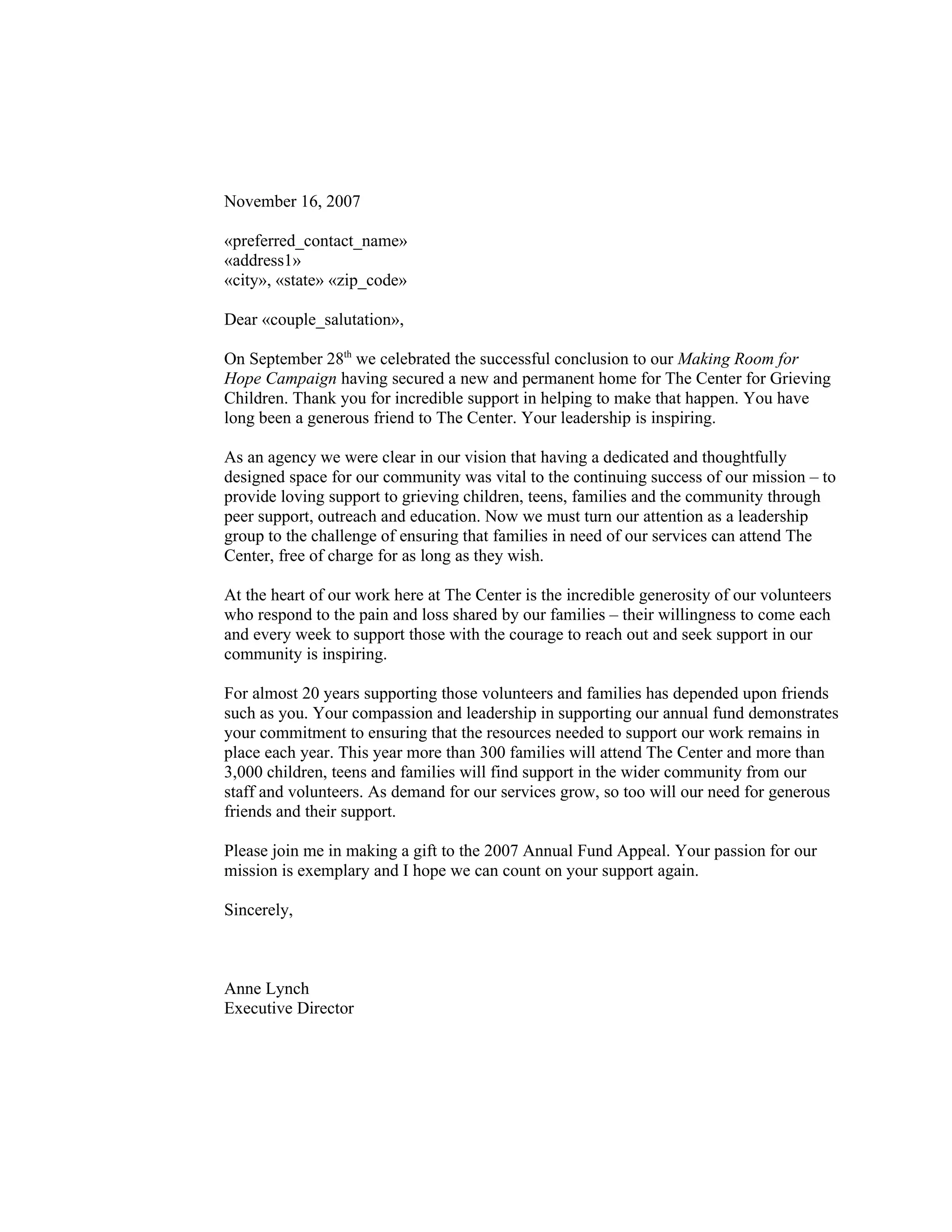 The Center for Grieving Children has secured a new permanent home after a successful fundraising campaign. They must now focus on ensuring families can attend services for free. Over 300 families and 3,000 children will be supported this year through volunteers and staff. The executive director is requesting a donation to the annual fund to support the growing demand for services and ensure resources are available each year.