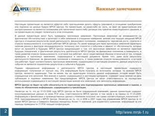 Документ представляет итоги деятельности компании МРСК Центра за 9 месяцев 2010 года и прогнозы на будущее, подчеркивая, что представленные прогнозные заявления не гарантируют будущих результатов и основаны на предположениях. Компания демонстрирует позитивные финансовые показатели и высокий уровень капитализации, что делает её привлекательной для инвестиций. Также в документе содержится информация о структуре управления и стратегии компании, направленной на отраслевое лидерство и рост.