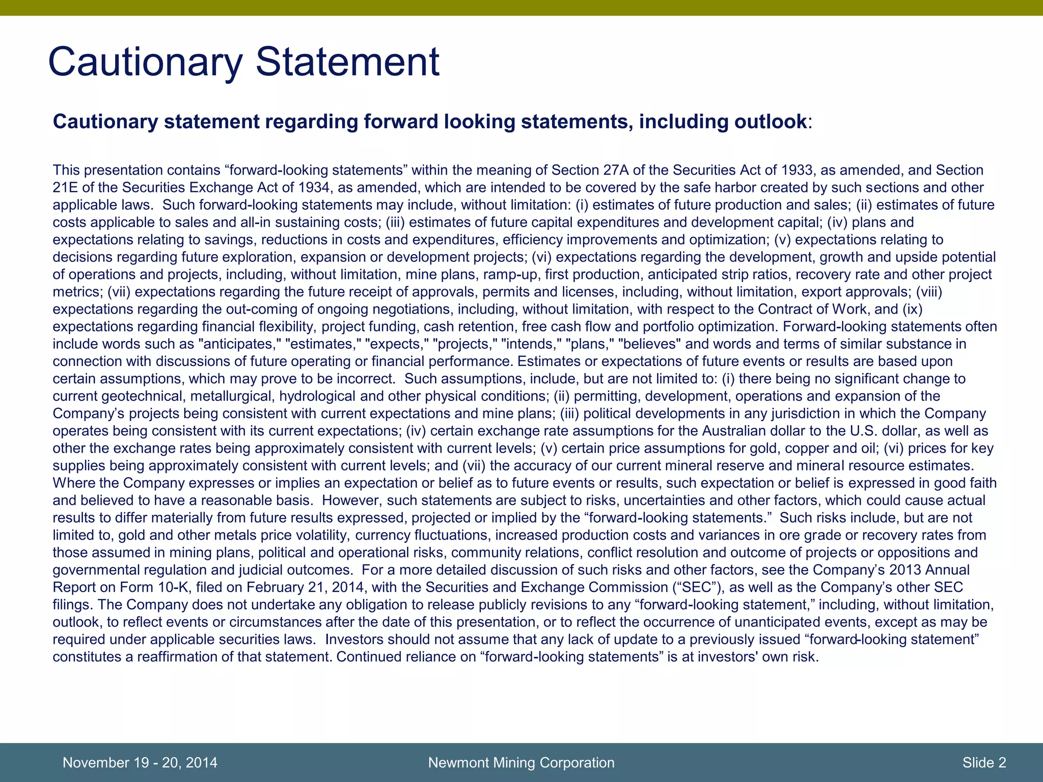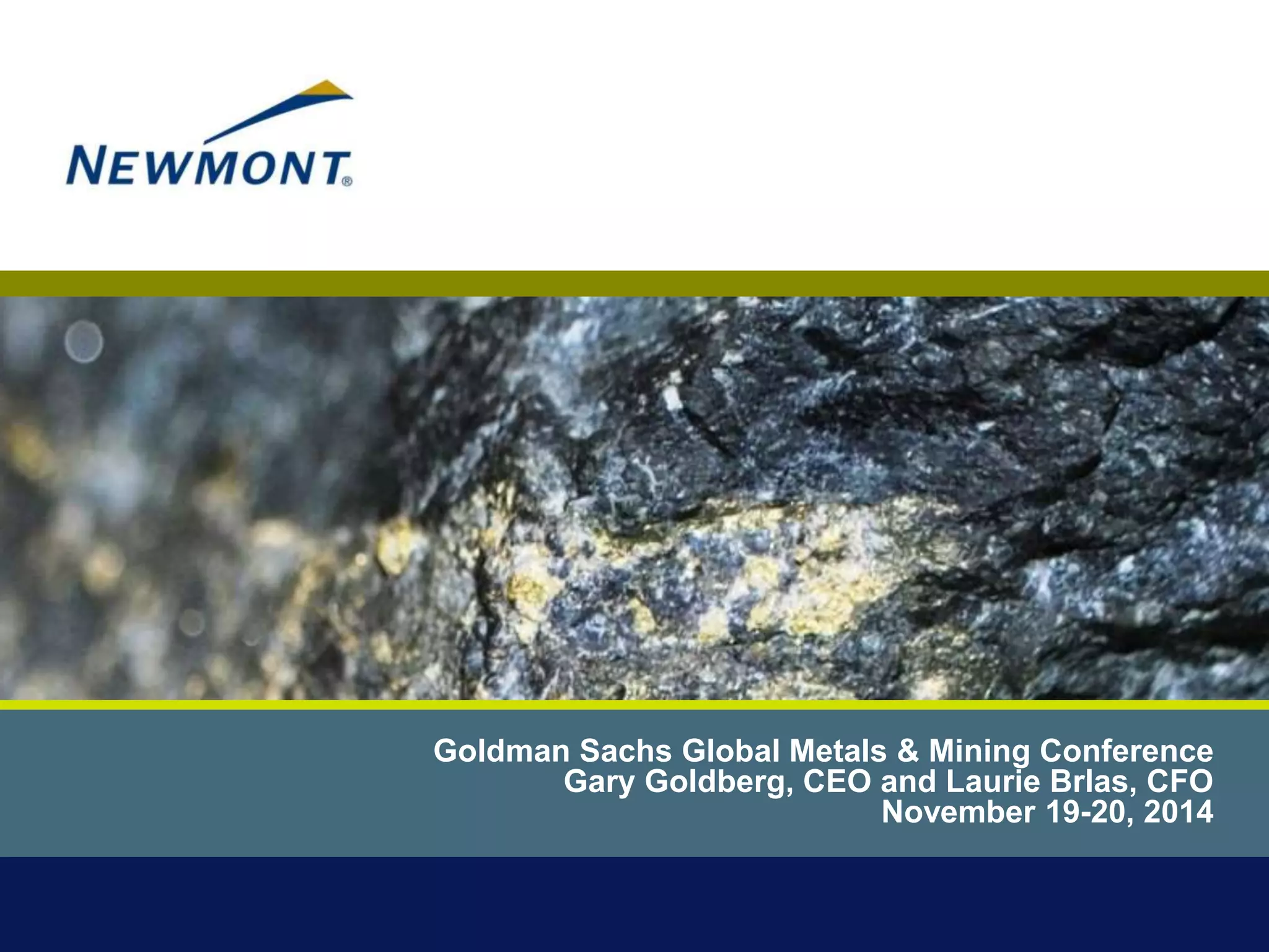 This document provides a summary and outlook from Gary Goldberg, CEO of Newmont Mining Corporation, and Laurie Brlas, CFO, at the Goldman Sachs Global Metals & Mining Conference on November 19-20, 2014. Key points include: Newmont has optimized its portfolio, improved safety performance, and reduced costs year-to-date; the company maintains a strong balance sheet, focuses on disciplined capital allocation, and is positioned to thrive across commodity price cycles. Newmont also discusses projects like Merian which offer favorable economics, and preparedness for ongoing market fluctuations to maintain positive free cash flow.