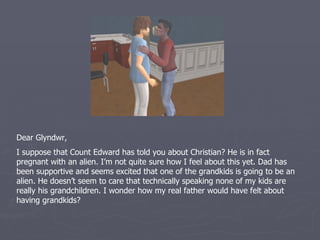 Glyndwr writes to Alfhild updating her on Toren's concerning behaviors. Toren has developed odd habits like insisting he can't sleep until "he comes" but won't say who, sitting with his eyes closed saying it's nothing, and screaming fits that put him in a near panic. Glyndwr is worried about Toren's increasing odd and distressing behaviors but unable to get clear answers from him about what is causing his distress.