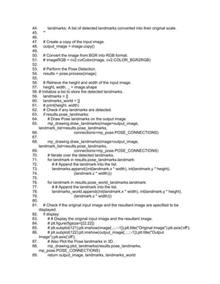 The document contains a Python script that utilizes various libraries including OpenCV and MediaPipe for detecting and classifying human poses. It defines functions for pose detection, angle calculation between landmarks, and displaying pose landmarks on images. Additionally, it includes logic to classify a specific pose related to a golf swing from a right side view using calculated angles of body joints.