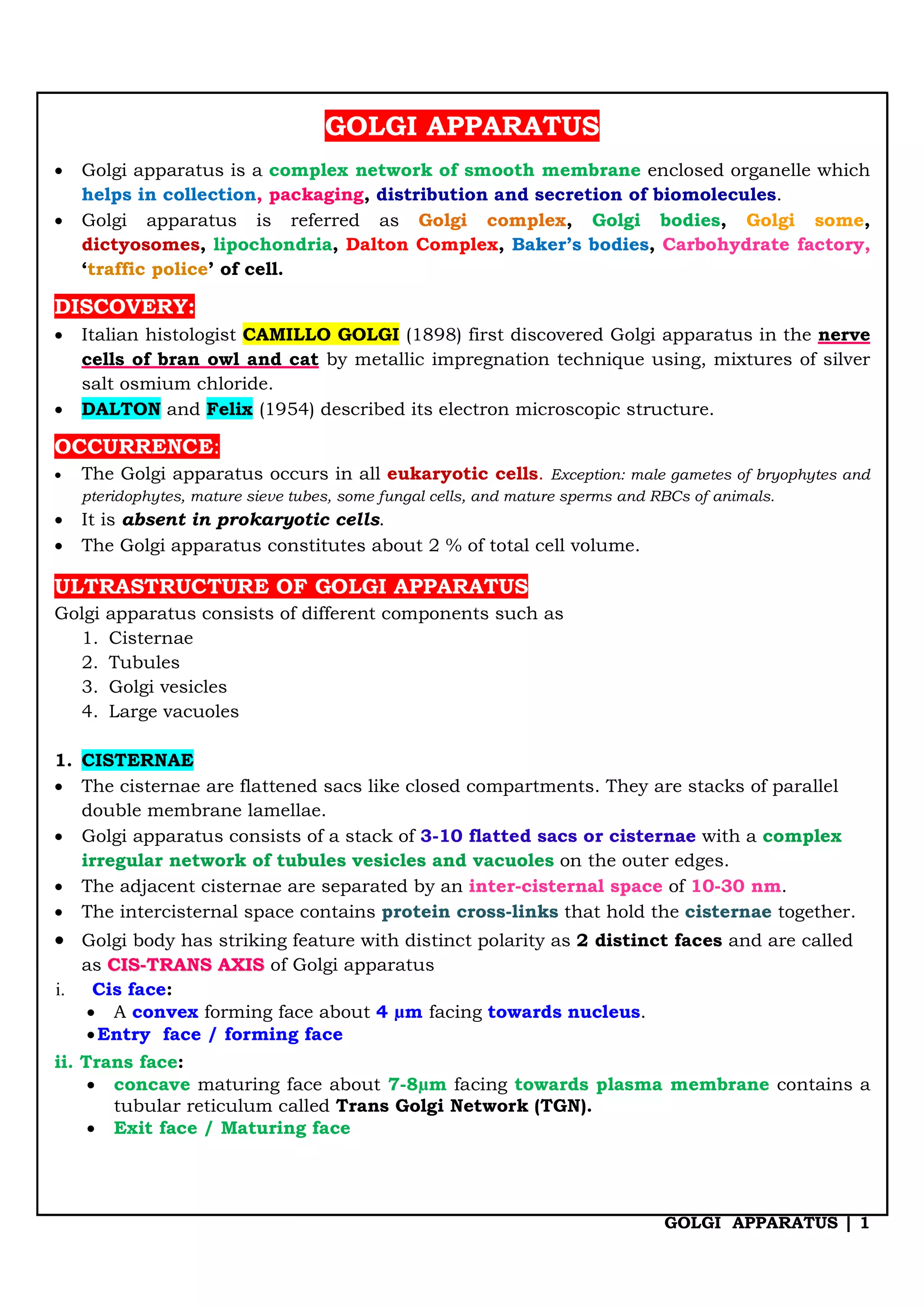 The Golgi apparatus is a membrane-bound organelle involved in the collection, packaging, and secretion of biomolecules. Discovered by Camillo Golgi in 1898, it is present in all eukaryotic cells except for certain cell types, and comprises structures such as cisternae, vesicles, and tubules. Its main functions include secretion, modification of proteins, and lipid packaging, essential for various cellular processes.