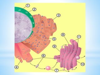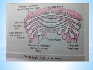 The document describes the structure and functions of the Golgi apparatus. It notes that the Golgi apparatus was discovered in 1898 by Camillo Golgi and is present in eukaryotic cells. It has a stacked structure consisting of cisternae, tubules, and vesicles. Materials enter on the cis face from the ER and are modified through secretion, synthesis, sulfation, phosphorylation, and other processes before leaving on the trans face via secretory vesicles. The Golgi apparatus plays an important role in secretion, synthesis of carbohydrates and proteoglycans, sulfation of molecules, apoptosis, and phosphorylation.