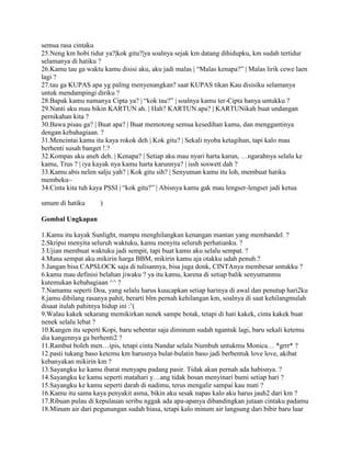 Dokumen ini merupakan kumpulan ungkapan gombal dan romantis yang disampaikan seorang pria kepada wanita yang dicintainya. Setiap ungkapan mengandung metafora dan perbandingan yang menarik, menggambarkan perasaan cinta dan kasih sayang. Dengan berbagai cara, penulis berusaha menyatakan betapa berharganya wanita tersebut dalam hidupnya.