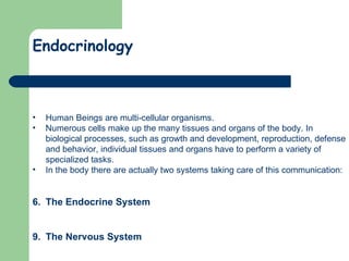 The endocrine system is a network of glands that secrete hormones directly into the bloodstream to regulate bodily functions. It works more slowly than the nervous system but has prolonged effects lasting hours to weeks. Hormones produced by endocrine glands control metabolism, growth, tissue function, and mood. The study of the endocrine system and its disorders is called endocrinology.