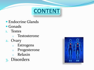 The document provides an overview of endocrine glands and hormones, specifically focusing on the gonads: testes and ovaries. It details the hormones produced, including testosterone, estrogens, progesterone, and relaxin, as well as their functions in regulating reproductive processes. Additionally, it outlines disorders related to hormonal secretion, such as hypogonadism and precocious puberty.