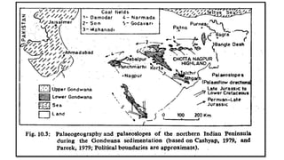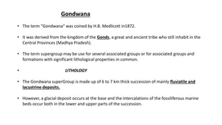 The document summarizes the Gondwana system of sedimentary rocks found in India. It describes the lithology, topography, sedimentation processes, flora and fauna of the different formations within the Gondwana group. These include the Talchir formation containing glacial deposits, the marine-influenced Bap and Badhaura formations, and the coal-bearing Damuda group. The climate changed from cold glacial conditions to warmer and wetter periods favorable for coal formation over the depositional period.