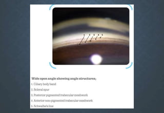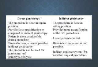 Gonioscopy allows examination of the anterior chamber angle using specialized lenses or prisms. It is used diagnostically to differentiate glaucoma types and prognostically to detect conditions that may cause future angle closure. There are two main methods: direct gonioscopy uses convex lenses to directly view the angle while indirect uses prisms and a slit lamp to provide an inverted mirrored image. Findings are documented using grading scales to classify angle width and structures visible. It is invaluable for glaucoma diagnosis and guiding treatment decisions.