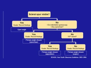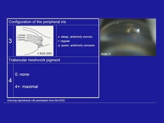 Gonioscopy is an examination of the anterior chamber angle using a gonioscopy lens and slit lamp microscope. It allows visualization of key angle structures including the trabecular meshwork, Schwalbe's line, scleral spur, and ciliary body band. The examination is used to diagnose glaucoma and angle closure risk. There are two main techniques - direct gonioscopy using a contact lens and indirect gonioscopy using a single or multiple mirror lens. Angle structures may be difficult to see, requiring manipulations like indentation and corneal wedge to improve visualization. Gonioscopy is essential for glaucoma evaluation and management.