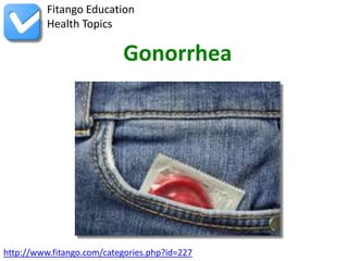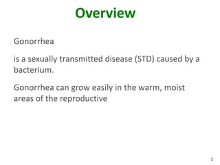 Gonorrhea is a sexually transmitted disease caused by bacteria that can infect several areas of the body, including the reproductive tract and throat. While some individuals may be asymptomatic, common symptoms include painful urination and unusual discharge, with potential serious complications such as pelvic inflammatory disease in women and epididymitis in men. Diagnosis is typically through urine tests or swabs, and although it can be cured with medication, drug-resistant strains are increasing, making treatment more challenging.