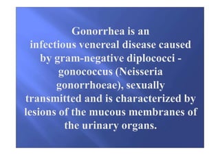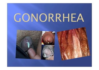 According to the document, gonorrhea is a common sexually transmitted infection caused by the bacterium Neisseria gonorrhoeae. It affects 200 million people per year globally. Gonorrhea has developed resistance to antibiotics and often causes complications when left untreated such as pelvic inflammatory disease and infertility. The document discusses the classification, symptoms, transmission, diagnosis and treatment of gonorrhea. It provides detailed information on the various forms and complications of gonorrhea in both men and women.