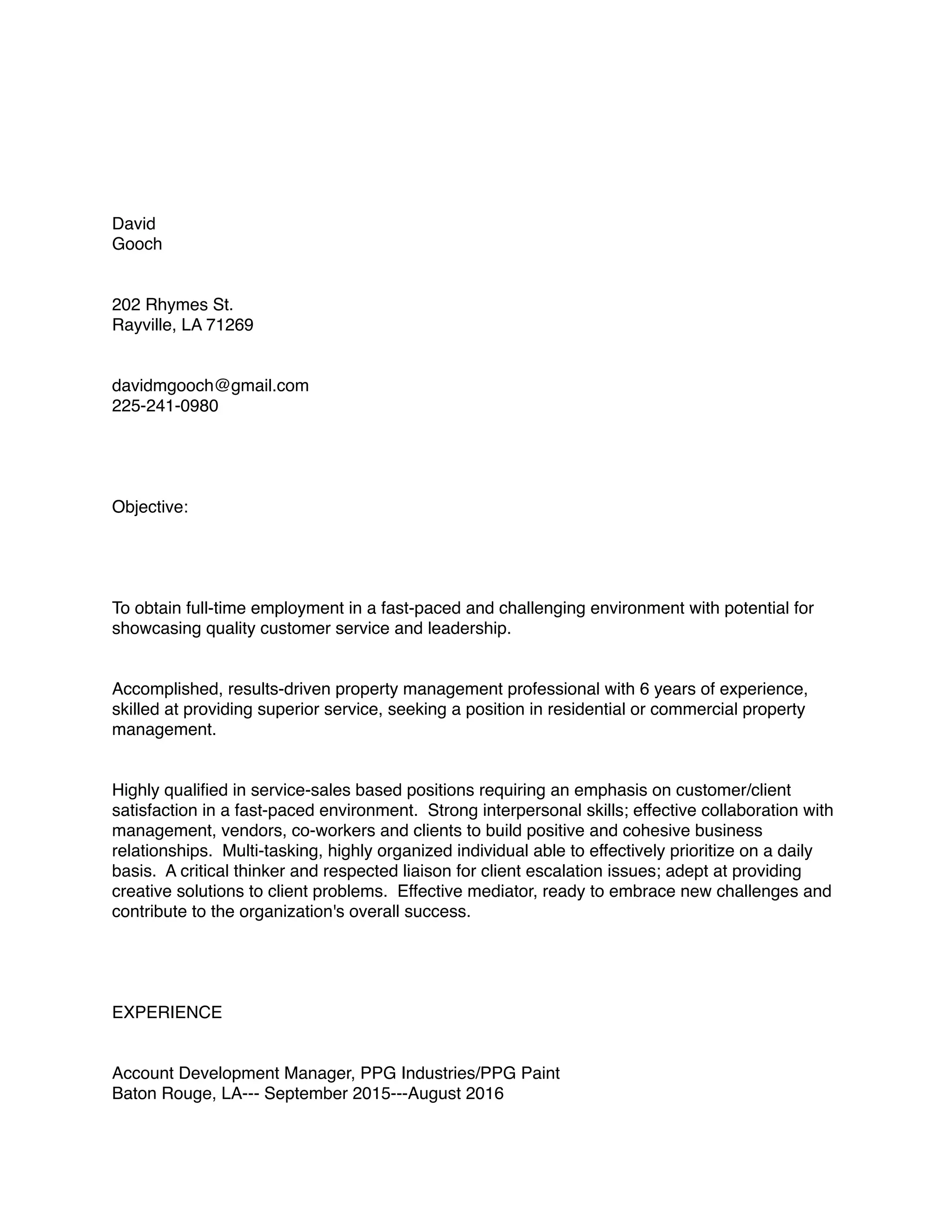 This document is a resume for David Gooch, who is seeking employment in property management. It lists his contact information and objective. It then details his experience over the past 6 years in property management roles of increasing responsibility, highlighting his skills in customer service, maintenance coordination, leasing, and financial management. References are available upon request.