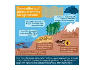 Climate is the average weather over time and can change due to natural or human factors. The document discusses how climate has changed in the past through ice ages and warming periods. It then explains that human activities like burning fossil fuels are releasing greenhouse gases like carbon dioxide, trapping heat and causing current climate change. Models show global temperatures rising over the last 100 years due to human activity. Future climate changes are expected to continue depending on emission levels, with impacts including sea level rise, ecosystem shifts, and more difficult conditions for plants, animals and humans.