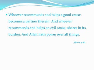 This 3 sentence verse from the Quran states that those who recommend and help a good cause will share in its reward, while those who recommend or help an evil cause will share in its burden, and that Allah has power over all things.