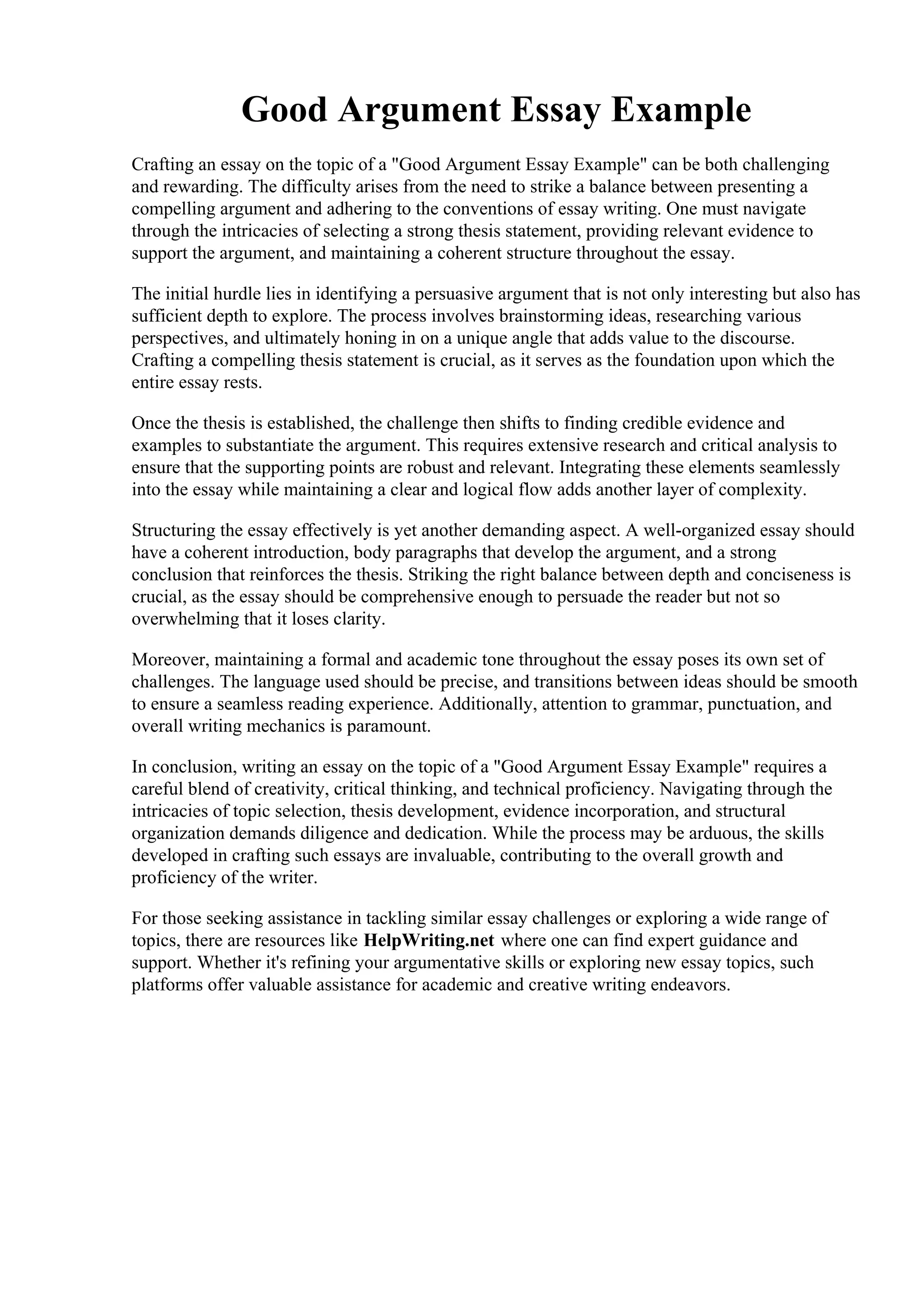 The document discusses the complexities and challenges of crafting a good argument essay, emphasizing the importance of a strong thesis statement, the use of credible evidence, and maintaining a coherent structure. It also touches on the need for creativity, critical thinking, and technical proficiency in writing, while highlighting resources available for assistance. Ultimately, while the writing process may be difficult, it fosters the development of valuable skills for the writer.