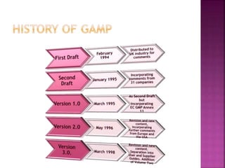 The document discusses Good Automated Manufacturing Practice (GAMP), which are guidelines for manufacturers and users of automated systems in the pharmaceutical industry published by the International Society for Pharmaceutical Engineering (ISPE). GAMP aims to ensure pharmaceutical products have the required quality by establishing principles and procedures for validating automated systems. Key aspects of GAMP covered in the document include focusing on building quality into each stage of manufacturing rather than testing it in, covering all production aspects from raw materials to staff training. The document also summarizes the GAMP5 guidelines released in 2008, which provide a framework for validating computerized systems to ensure they are fit for use and compliant with regulations. GAMP5 emphasizes product and process understanding, a lifecycle approach,