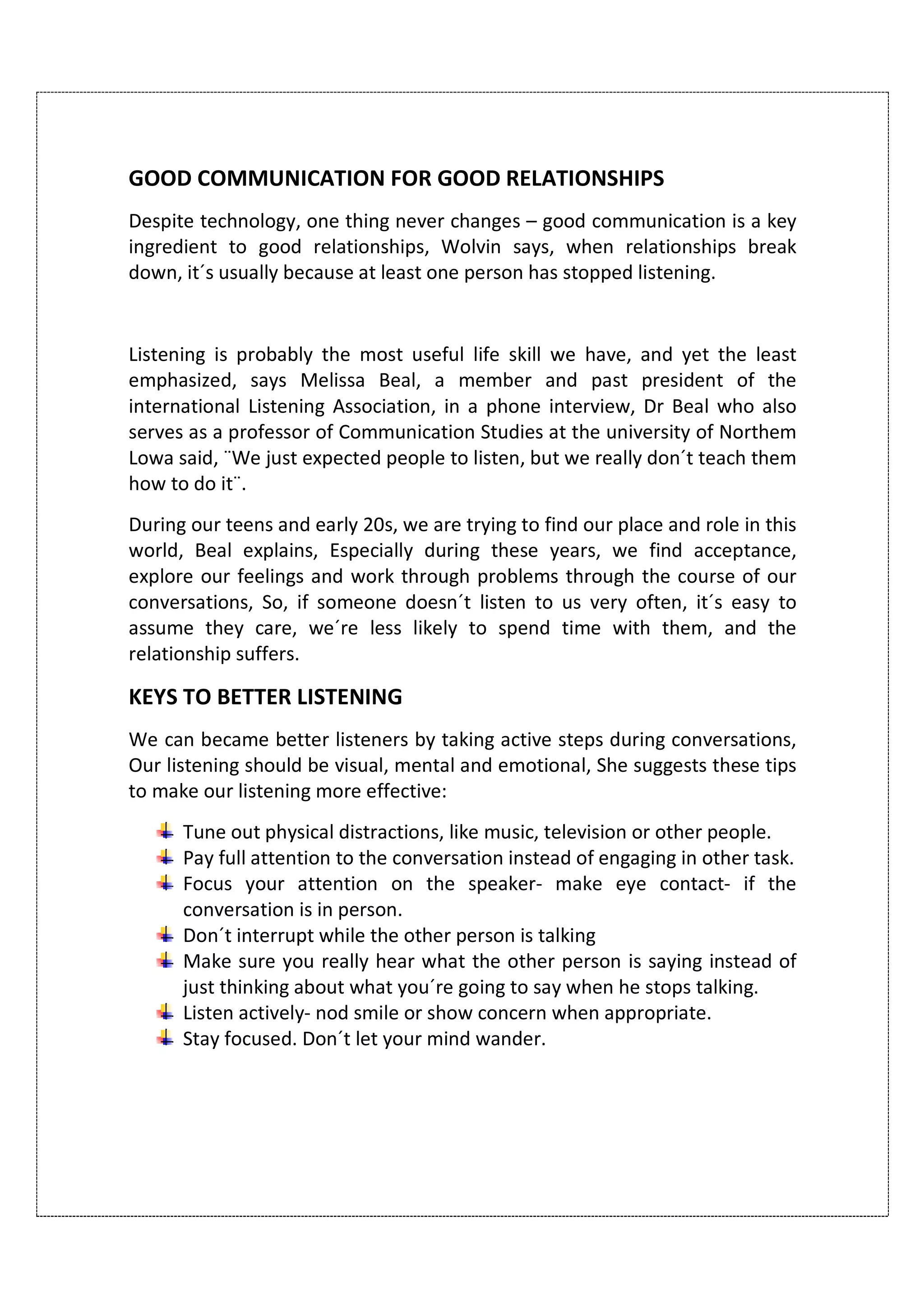 The document discusses the importance of good communication for maintaining relationships. It notes that relationships often break down due to a lack of listening. Listening is an important life skill, but one that is not often emphasized or taught. During teenage and young adult years, listening is especially important as that is when people explore their feelings and work through problems through conversations. The document then provides tips for becoming a better listener, such as focusing attention on the speaker, avoiding distractions, not interrupting, and actively listening through eye contact and body language.