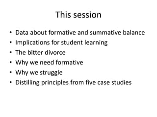 This document discusses formative and summative assessment and the importance of balancing the two. It analyzes data showing assessment patterns with different programs and how formative versus summative assessment relates to deep versus surface learning. The document also examines why formative assessment is important but often struggles to be implemented, providing several theories for this. Finally, it outlines five case studies of programs successfully incorporating formative assessment and has attendees brainstorm principles from these cases to adapt for their own disciplines.
