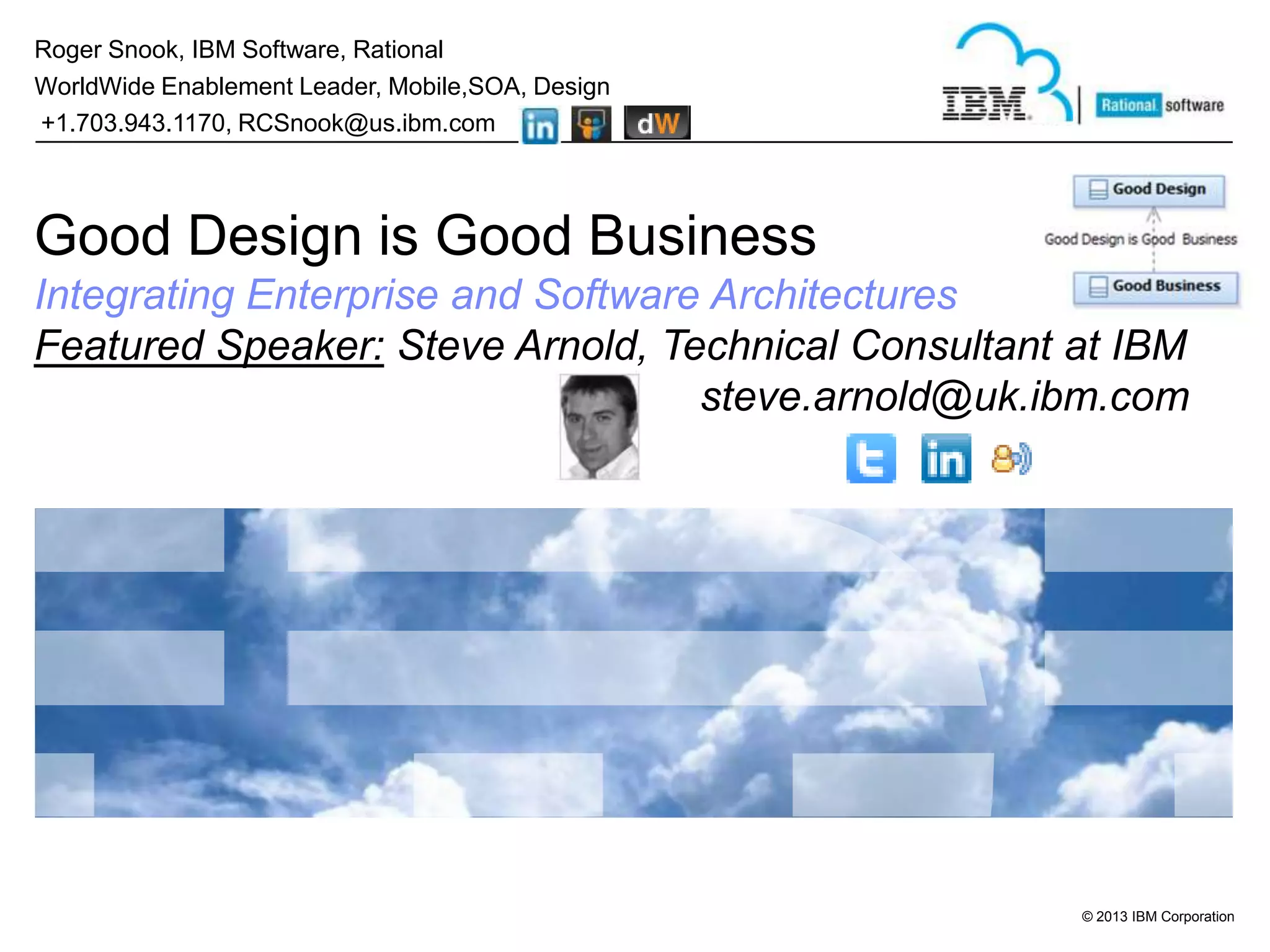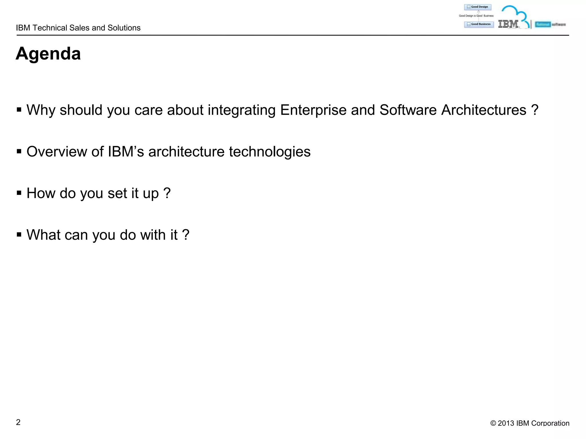 The document discusses integrating enterprise and software architectures. It provides an agenda that covers why the integration is important, an overview of IBM's architecture technologies, how to set up the integration, and what can be done with it. The integration allows enterprise architects, software architects, and infrastructure architects to link models and tools from different domains. This helps address common questions that arise across roles and improves collaboration. The document demonstrates how to set up and follow links between IBM Rational Software Architect and IBM Rational Design Manager.