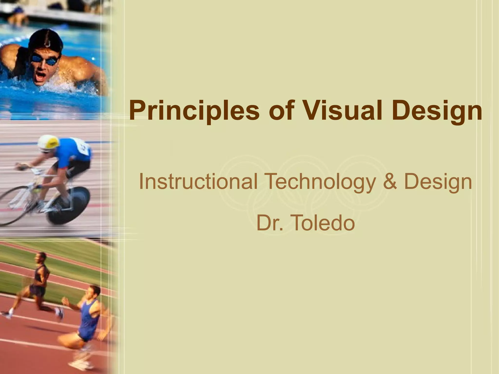 This document discusses basic principles of visual design for presentations and websites. It emphasizes grouping related items together through proximity and alignment. Elements should be repeated throughout the design for consistency, and contrast used to differentiate things that are not the same. Visual hierarchies should make more important items more prominent and relate logical groupings visually through positioning and spacing. Text elements like headings, lists, and formatting help provide clarity and emphasis. Dense blocks of filler text should be avoided in favor of well-structured paragraphs with appropriate line spacing.