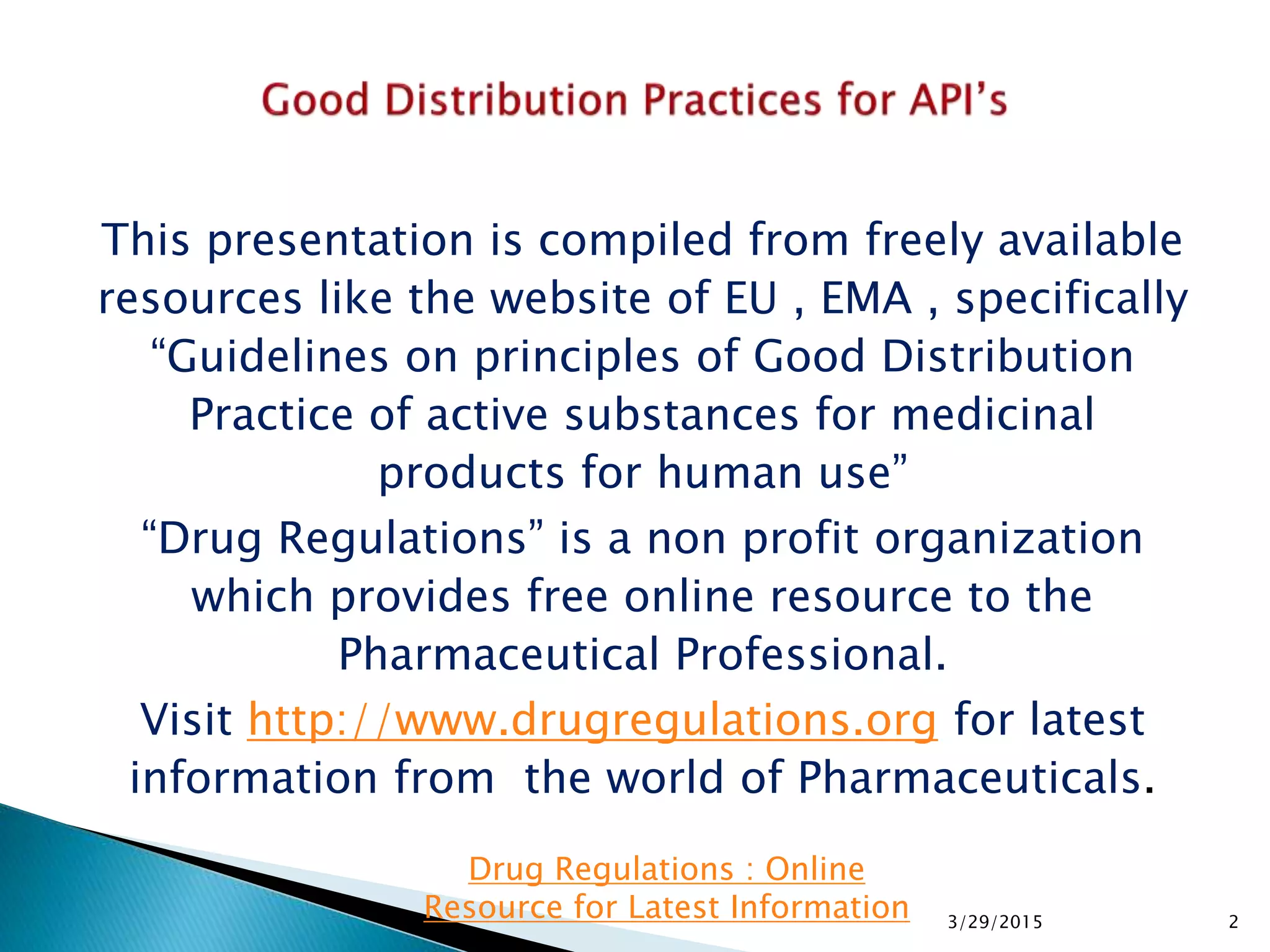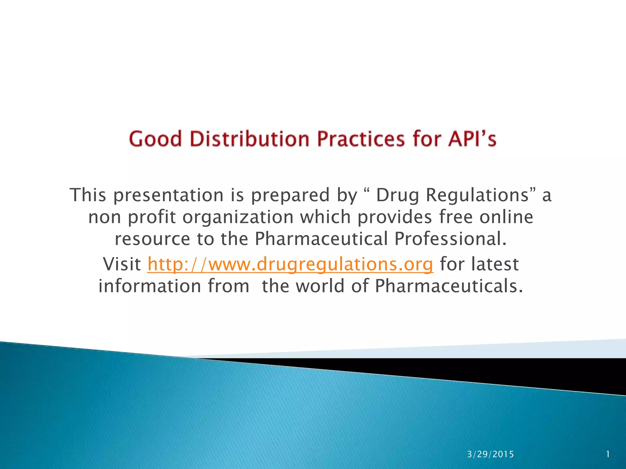 This presentation by 'Drug Regulations' summarizes the guidelines on good distribution practices for active substances in human medicinal products, published in March 2015, with preliminary comments open until February 2013. It outlines the responsibilities of importers and distributors, the importance of quality systems, and the necessary documentation and procedures for compliance with regulations. The guidelines are effective as of September 21, 2015, and emphasize the importance of ensuring the integrity and safety of active substances throughout the distribution process.