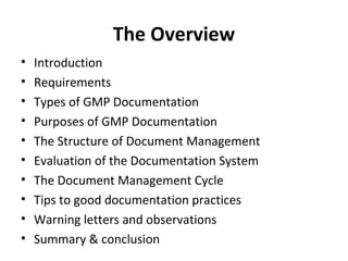 This document discusses good documentation practices for GMP compliance. It defines what documentation is, outlines the types of documents required by GMP such as batch records and SOPs. It explains the importance of documentation for meeting legal requirements, business needs, and enabling good decision making. It provides tips for writing good documentation including structure, approvals, version control, and retention. Overall it emphasizes that documentation is critical to demonstrate regulatory compliance and quality.