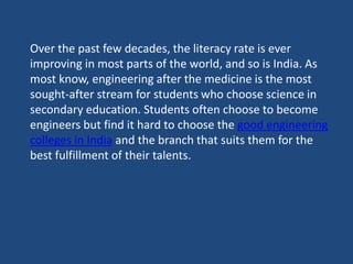 The document discusses the criteria for choosing good engineering colleges in India, emphasizing the importance of rankings, accreditations like AICTE, and campus placements. It highlights the relevance of research orientation for students interested in academic paths, along with the funding opportunities available for research projects. The analysis includes an example of MIT Academy of Engineering as a reputable institution with notable accreditations and corporate connections.
