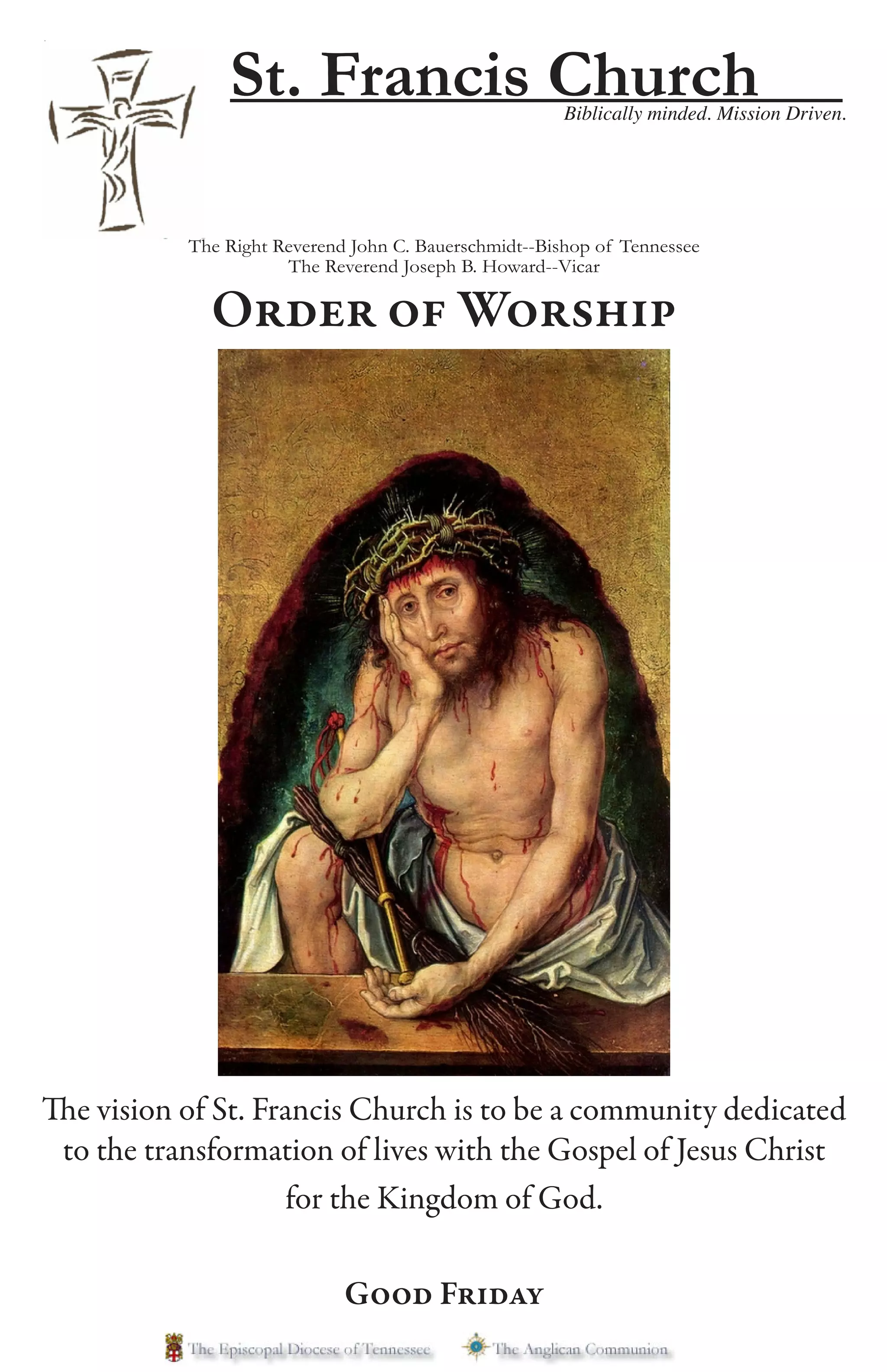 This document provides the order of worship for Good Friday at St. Francis Church. It includes an opening note welcoming visitors, a statement about encouraging families to worship together, and details about childcare being available. The order of worship then begins, including opening prayers, readings from Isaiah and Hebrews, and the passion Gospel reading from John which recounts Jesus' arrest and trials.
