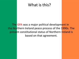 The Good Friday Agreement established a major political framework for peace in Northern Ireland. It was agreed upon by the British and Irish governments as well as eight political parties in Northern Ireland. Key aspects of the agreement included establishing a Northern Ireland Assembly with legislative powers, forming a power-sharing Executive Committee, and outlining commitments to human rights, disarmament of paramilitary groups, and the future status of Northern Ireland remaining part of the UK. However, implementation faced challenges including parliamentary crises over the IRA's refusal to disarm and a bank robbery attributed to the IRA.