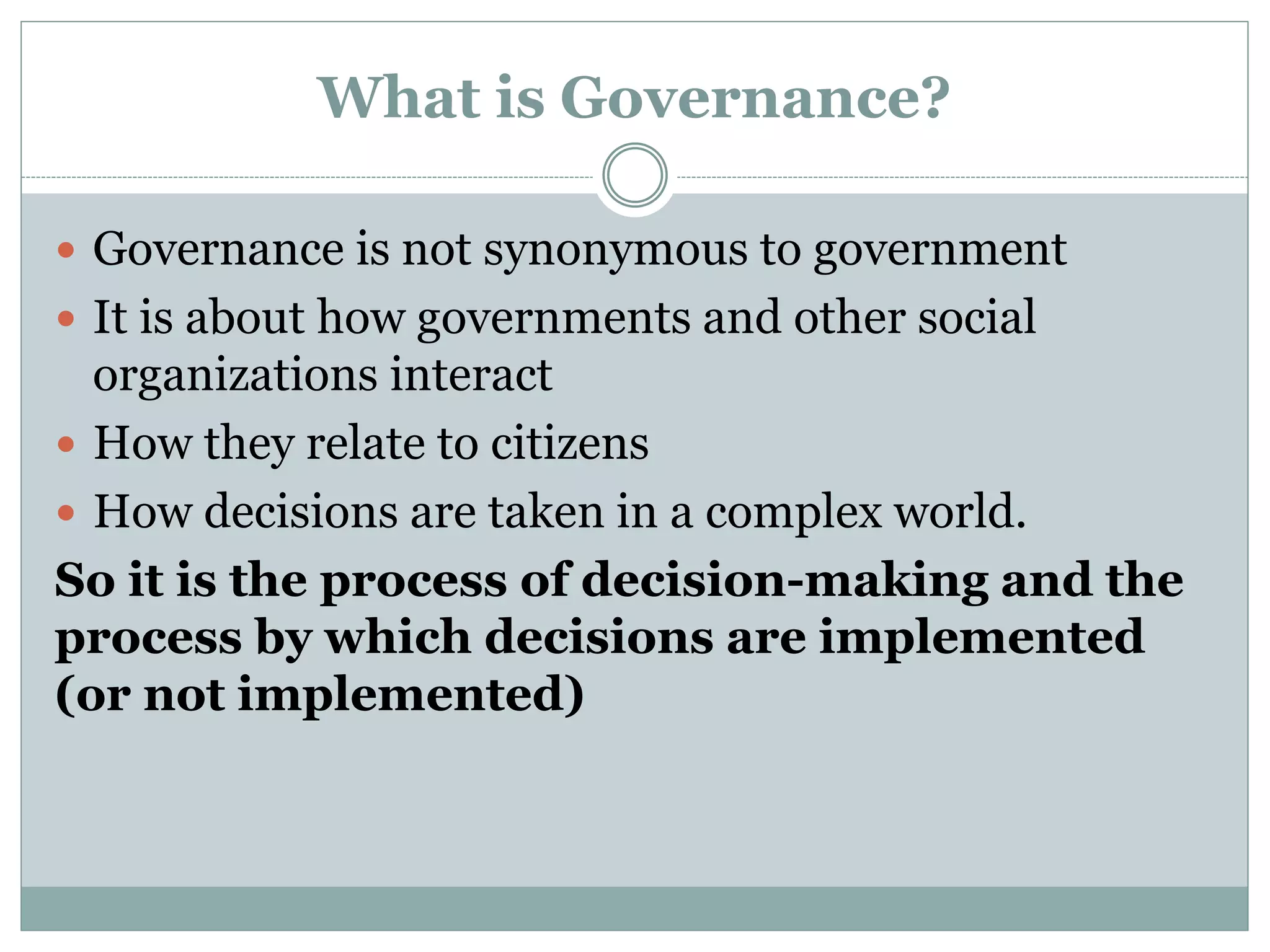 The document discusses governance, emphasizing that it encompasses more than just government and includes how decisions are made and implemented in society. It highlights the role of e-governance in promoting good governance through technology, making services more accessible and efficient while also addressing the challenges faced, such as corruption and lack of infrastructure. Examples from various Indian states illustrate successful implementations of e-governance initiatives that enhance service delivery and transparency.