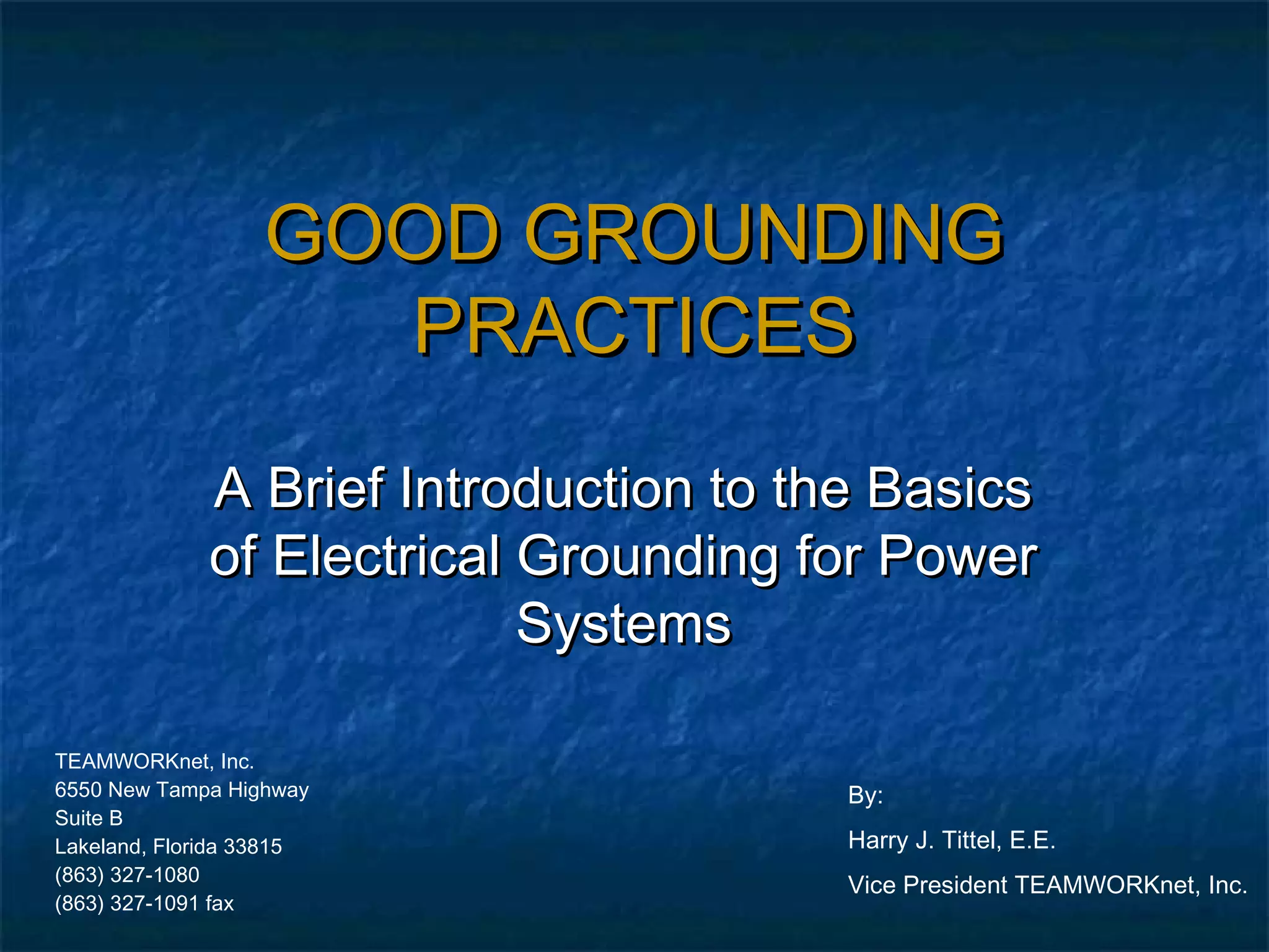 The document provides an introduction to electrical grounding practices for power systems. It discusses the primary goals of grounding for safety and protection. It also describes the different types of grounding systems used in industry, including ungrounded, solid ground, low resistance ground, and high resistance ground. Each system is characterized by its handling of faults, safety aspects, reliability and economics.