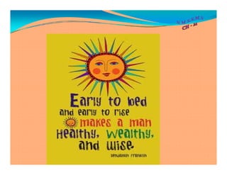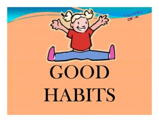 This document provides a list of good habits for students to practice daily, including waking up early, brushing teeth twice a day, praying morning and night, having a bath and wearing clean clothes, eating healthy meals, doing homework regularly, playing outside, and going to bed early. It emphasizes maintaining personal hygiene, eating a balanced diet, exercising daily, crossing the road safely, being on time for school, and covering your face when coughing or sneezing. The list of habits was created by the North Madras Social Service Middle School in Chennai, India.