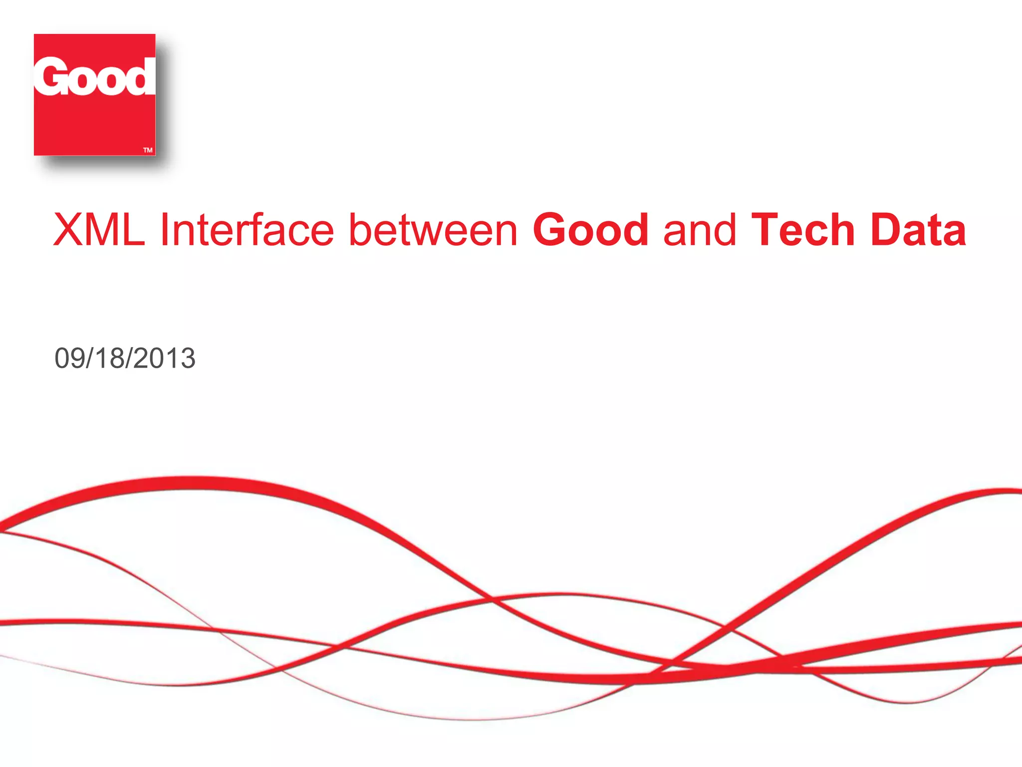 The document discusses Good Technology's plan to implement an XML interface with Tech Data to automate the exchange of purchase orders and quotes between their systems. Currently, this process is done manually through email. The new interface will use XML to automatically send quotes from Good Technology's Salesforce system to Tech Data, and receive purchase orders back. This will streamline the quote-to-cash process and allow faster communication and order execution between the companies. The project will proceed through testing and implementation stages with defined resource commitments from both companies.