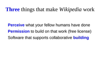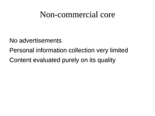 The document discusses the evolution and significance of Wikipedia, highlighting its collaborative model, user engagement, and the challenges it faces, such as declining contributor numbers and issues of content reliability. It emphasizes Wikipedia's role as an inclusive media platform that operates under free licenses, with a large, active user base and substantial global reach. Moreover, it outlines Wikimedia's strategic plan to enhance technological and operational capacities to support the increasing reliance on its projects.