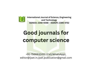 The document emphasizes the importance of real-time projects and research articles for computer science students completing their degrees, particularly for those interested in academic careers. It outlines features of the International Journal of Science, Engineering and Technology, including its online submission system, open access policy, and publication fees. Additionally, it provides guidance on how to identify reputable journals, focusing on ISSN, mode of publication, journal type, indexing, and open access availability.