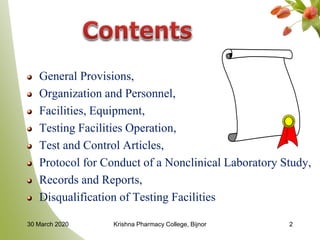This document discusses Good Laboratory Practice (GLP), a regulatory quality system established by the FDA in the 1970s to ensure the reliability and integrity of non-clinical health and environmental safety studies. It outlines the historical context of GLP, its principles, objectives, and the importance of maintaining high standards in laboratory practices, as well as consequences for non-compliance. The content includes sections on organization, facilities, personnel qualifications, testing protocols, and record-keeping requirements.