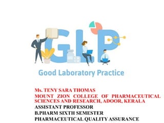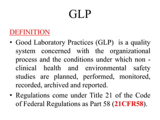 The document outlines Good Laboratory Practices (GLP), a quality assurance system established by the FDA to ensure the reliability of non-clinical health and safety studies, including their planning, performance, and reporting. It details the objectives, advantages, and disadvantages of GLP, as well as the organizational structure, responsibilities of personnel, and specific requirements for facilities, equipment, and testing operations. Additionally, it stresses the importance of maintaining quality data and compliance during the research and development of pharmaceutical products.
