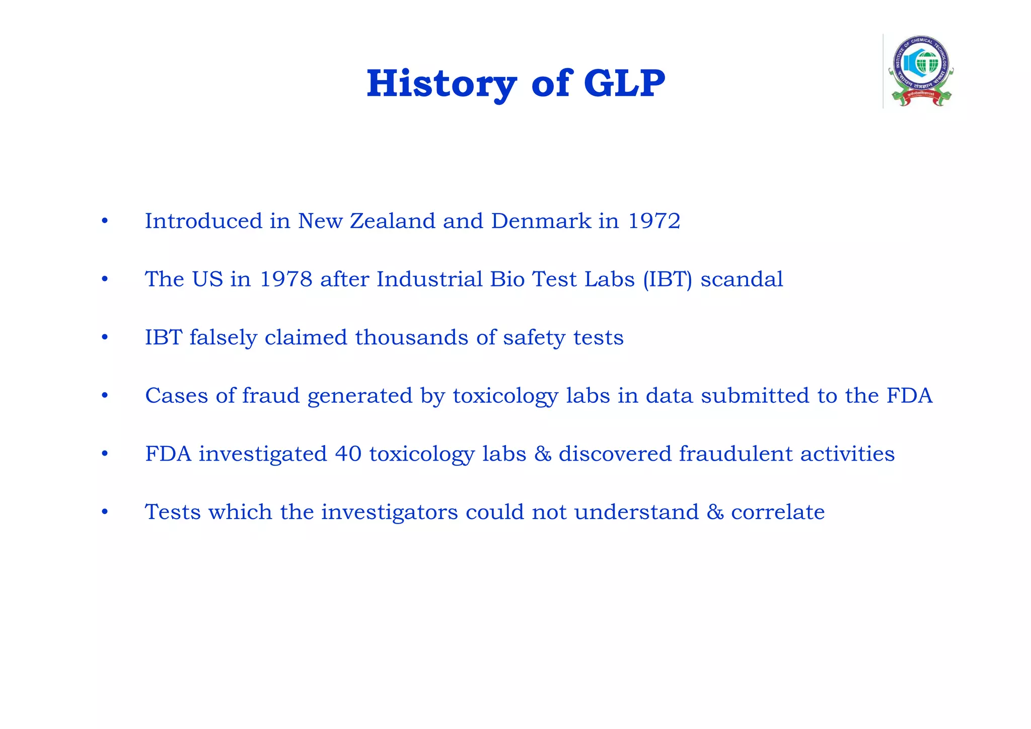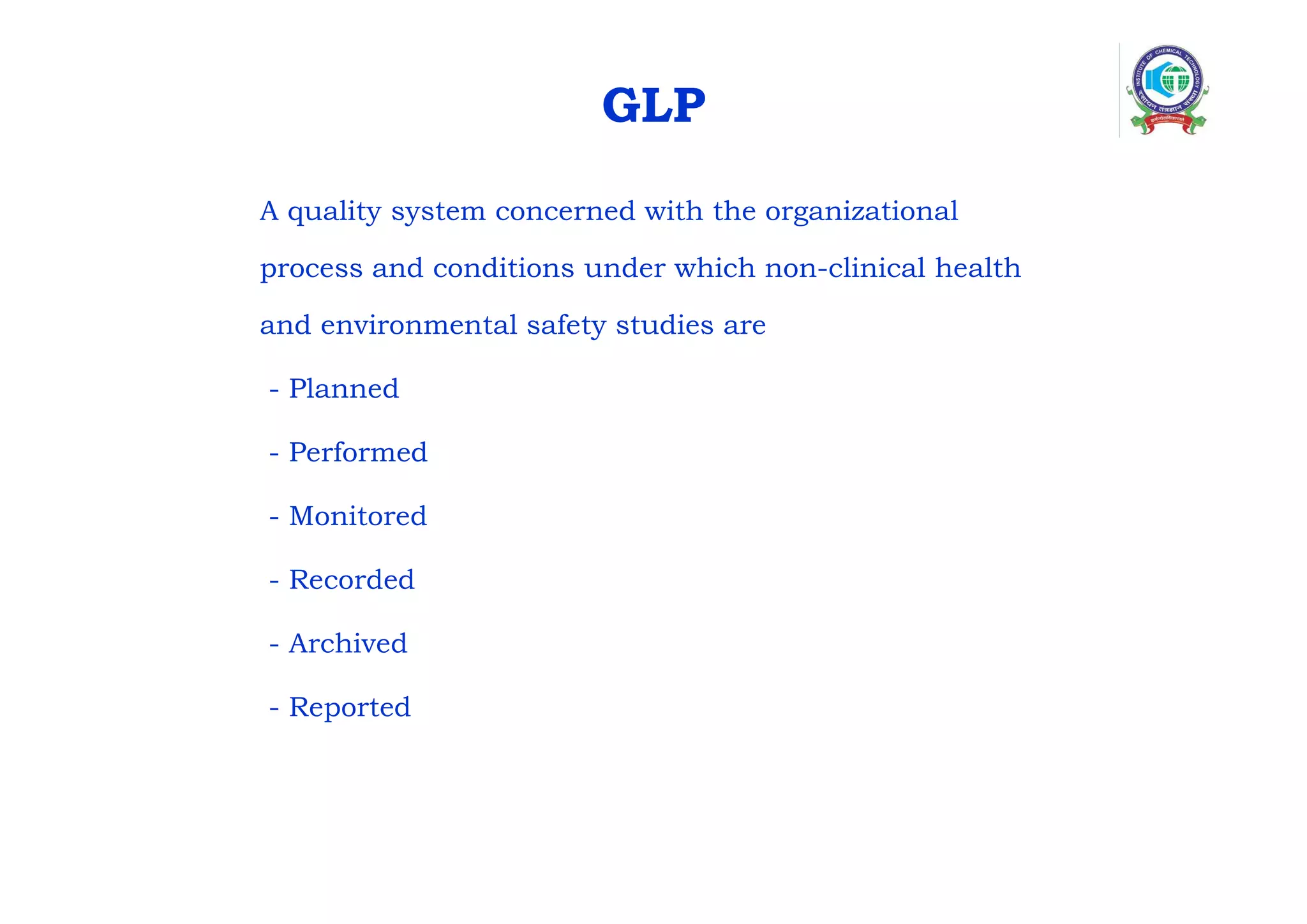 GLP (Good Laboratory Practice) is a quality system for non-clinical health and environmental safety studies. It aims to ensure quality, uniformity, consistency, reproducibility, traceability, reliability and integrity of test data. Key aspects of GLP include standardized procedures for conducting studies, recording and reporting data, and archiving records and materials. GLP was established after fraud was discovered in toxicology lab data submitted to regulators. Adherence to GLP helps ensure the reliability and integrity of non-clinical safety studies.