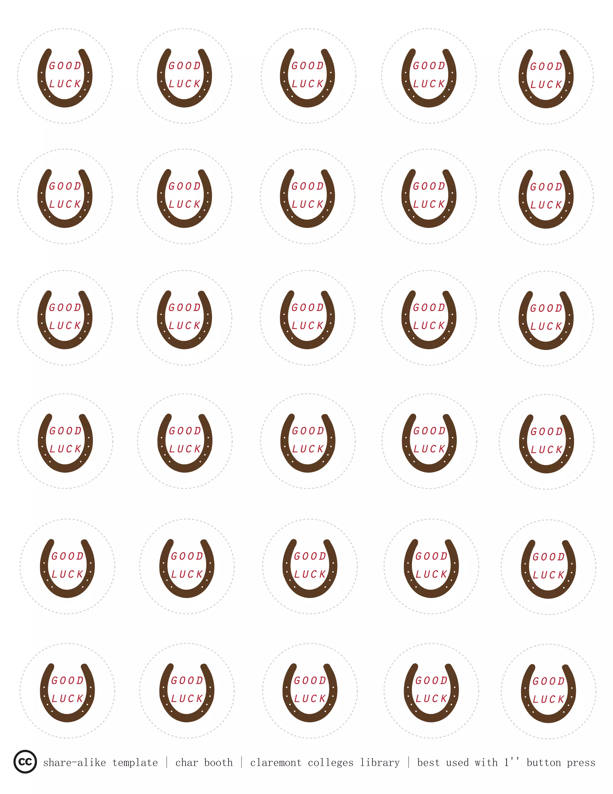 The document features repetitive phrases emphasizing 'good' and 'luck.' It suggests a share-alike template associated with Char Booth and Claremont Colleges Library, intended for use with a 1-inch button press. Overall, it focuses on the theme of luck in a creative context.