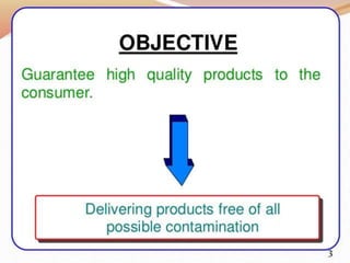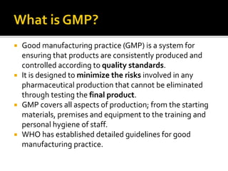 The document outlines WHO guidelines for good manufacturing practices (GMP) in the pharmaceutical industry. It discusses how GMP ensures quality control throughout the production process, from procurement of materials to finished products. Key aspects covered include facilities and equipment qualification, sanitary conditions, documentation practices, personnel training, and quality control testing. Adhering to GMP is important for minimizing risks and ensuring patient safety.