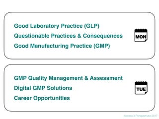 The document outlines various practices related to Good Manufacturing Practice (GMP) and Good Laboratory Practice (GLP) aimed at ensuring quality and compliance in scientific research and manufacturing. It details principles, historical regulations, and quality assurance measures necessary for reliable scientific outcomes and safe products. Additionally, it addresses potential misconduct and emphasizes the importance of documentation and training in maintaining ethical standards in these practices.
