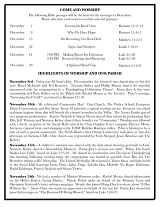 The document provides information about upcoming events at the First United Methodist Church of North Hollywood including a Christmas tree lot, Operation Gratitude volunteer event, chili cook-off, holiday luncheon, organ concert, Christmas Eve services, children's choir performance, and tips for donating Christmas cards. It also recaps recent church events like a community worship service and care kit assembly for the homeless.