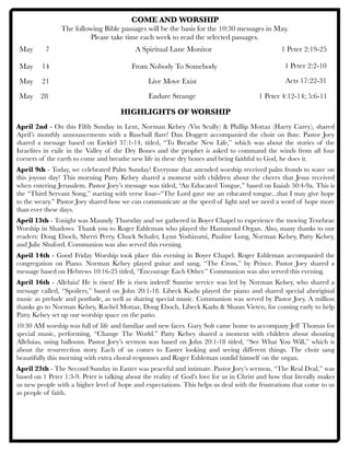 The document is the May 2017 newsletter from the First United Methodist Church of North Hollywood. It includes information about upcoming events like a Mother's Day brunch, film night, and missions activities. It provides details on recent worship services and sermon topics. It also discusses current United Methodist Church events including the announcement of a special General Conference in 2019 to address issues around homosexuality. Finally, it advertises the return of Adult Sunday School and lists books recently donated to the church library.