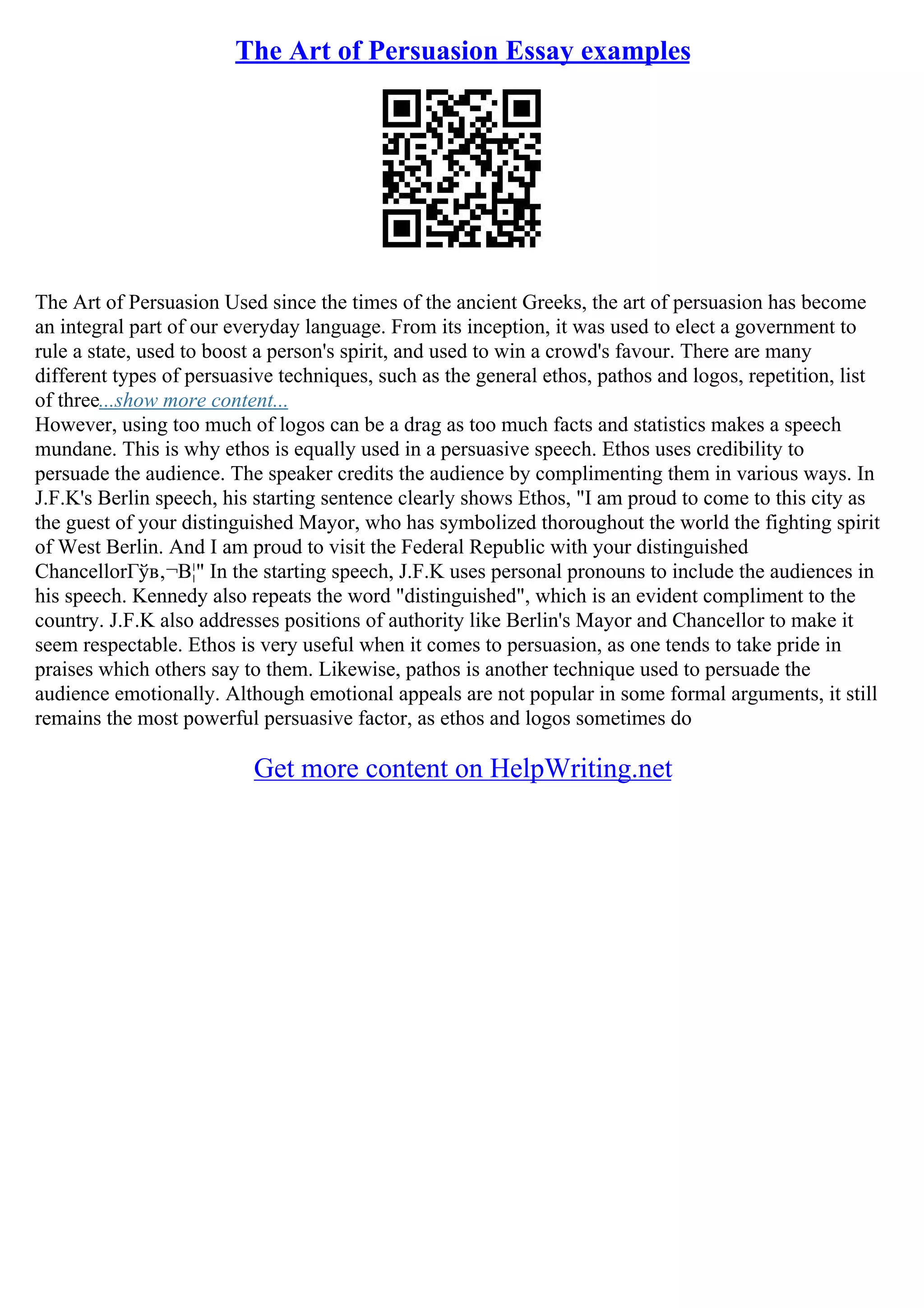 The document discusses the art of persuasion and provides examples of persuasive techniques used in speeches. It discusses the three main types of persuasive techniques - ethos, pathos, and logos. As an example, it analyzes JFK's 1963 "Ich bin ein Berliner" speech in Berlin, noting how he uses ethos to establish credibility and compliment the audience. While logos provides facts, too much can make a speech dull, so ethos is equally important in persuasive speaking. The document also stresses that pathos, appealing to emotion, remains a powerful persuasive factor.