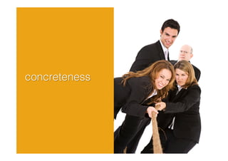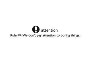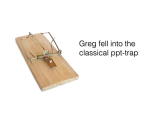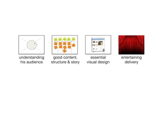 The document provides tips for designing effective PowerPoint presentations, focusing on understanding the audience. It recommends profiling the audience to understand what they see, hear, think and do. It also suggests defining the context, role and main points to clarify the message, and brainstorming what the audience wants to know. The content should be organized into columns grouped by theme. Stories that resonate with the audience should be injected. Visual design should respect cognitive limitations using stimuli like questions and interaction. Rehearsal is also emphasized for delivery.